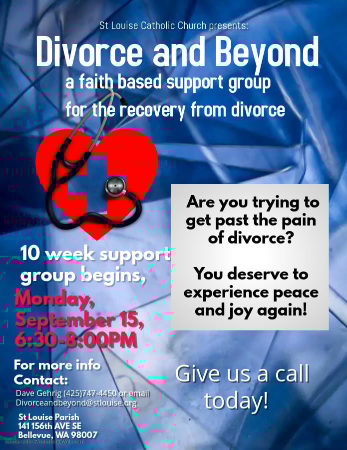 Are you trying to get past the pain of divorce? Are you feeling “stuck” in pain and hurt? St. Louise Catholic Church is thrilled to be offering “Divorce & Beyond”. This is an excellent 10 week Christian based program of healing and recovery from divorce. You deserve to experience peace and joy again! Gift yourself with healing this program through the Divorce & Beyond experience! Interested? We will meet on Tuesdays, 6:30-8PM at St Louise Parish beginning on Sept. 15, 2025.. The cost is $15 and scholarships are available. If you’d like more information please contact David Gehrig at 425-214-5466 or email divorceandbeyond@